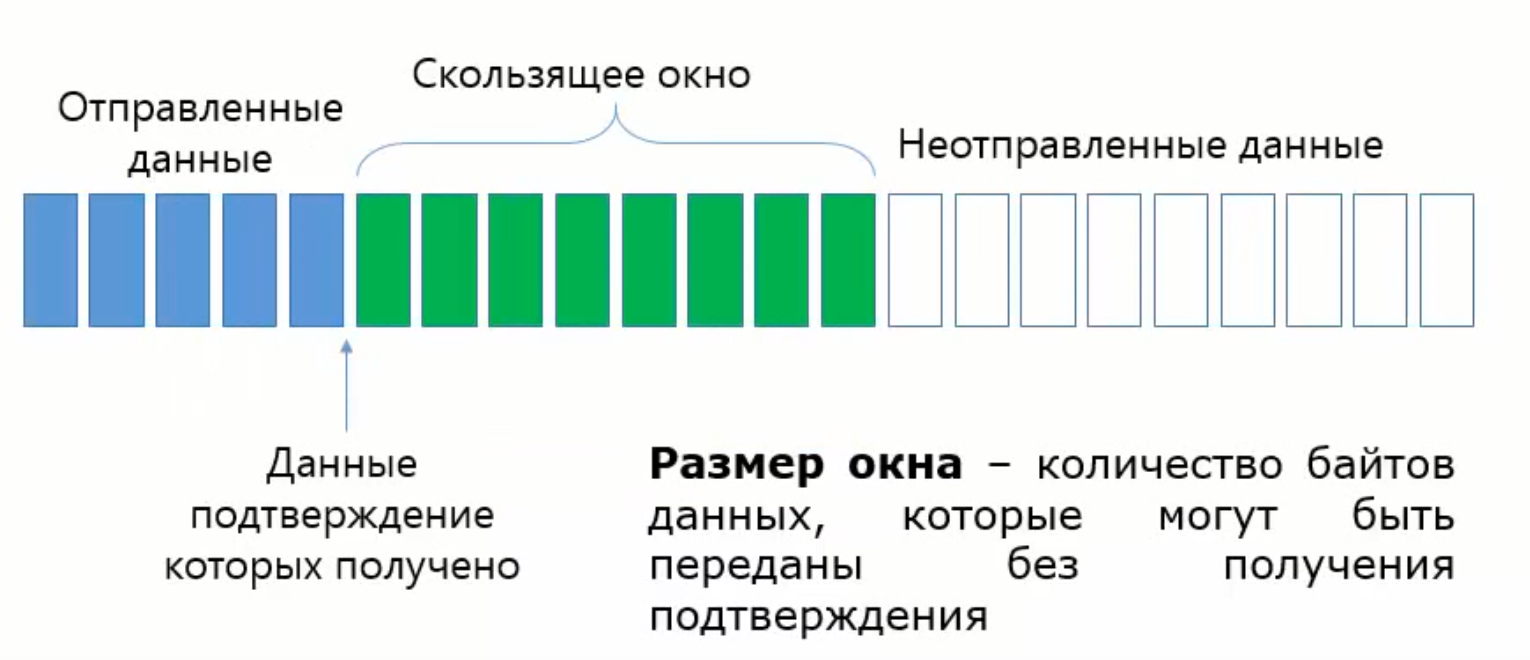 Так как на отправка каждого сегмента должна получить подтверждение, пропускная способность соединения по TCP сильно уменьшается, для того чтобы с этим бороться протокол не отправляет по одному сегменту, и не ждет подтверждения, отправка идет сразу по несколько сегментов, пакет сегментов отправленных без подтверждения называется скользящим окном.