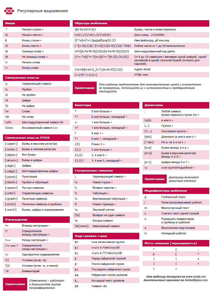 Регулярные выражения(Regular expression) - ормальный язык поиска и осуществления манипуляций с подстроками в тексте, основанный на использовании метасимволов. Для поиска используется строка-образец ("шаблон", "маска"), состоящая из символов и метасимволов и задающая правило поиска. Для манипуляций с текстом дополнительно задаётся строка замены, которая также может содержать в себе специальные символы.